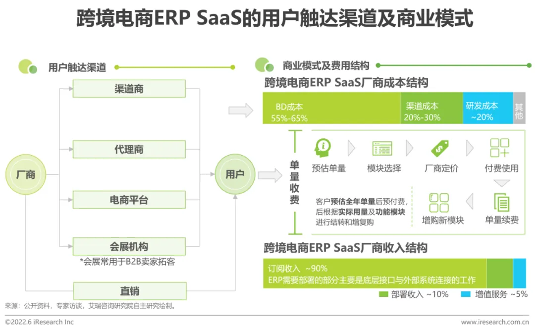 用户触达沿用SLG,采用单量+订阅的“储值式”收费模式跨境电商ERP SaaS厂商可以通过渠道商、代理商、电商平台内部推荐机制和直销的形式触达B2C跨境电商企业,也会通过会展机构触达B2B跨境电商企业。从成本上看,销售为主的BD成本和渠道成本占比近80%,是典型的SLG模式。触达企业后,企业需要预估全年成单量,并根据功能模块预付产品使用费,在次年根据实际成单量和新增模块数重新计费。