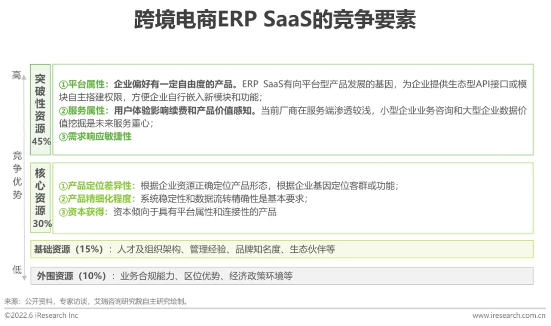 产品成熟,用户需求递增,未来服务和平台属性是主要竞争力竞争要素:跨境ERP SaaS厂商的核心竞争力是产品和伙伴资源,具象的产品功能和产品定位帮助厂商切入市场并占有一席之地。而ERP SaaS所拥有的平台属性与服务属性是厂商在市场竞争中胜出的突破性要素,也将成为该赛道竞争的主要发力点。此外,在SaaS厂商发展前期及黑天鹅事件多发的环境下需要充足的资本支撑,因此资本充裕程度也是核心竞争力之一。竞争格局:由于跨境电商ERP SaaS为企业提供的基础运营管理功能在跨境电商企业内渗透率和接受度较高,同时具有平台属性,因此颇受资本青睐。目前赛道初步步入成熟期,长尾厂商较多,第一梯队厂商市占率约40%。