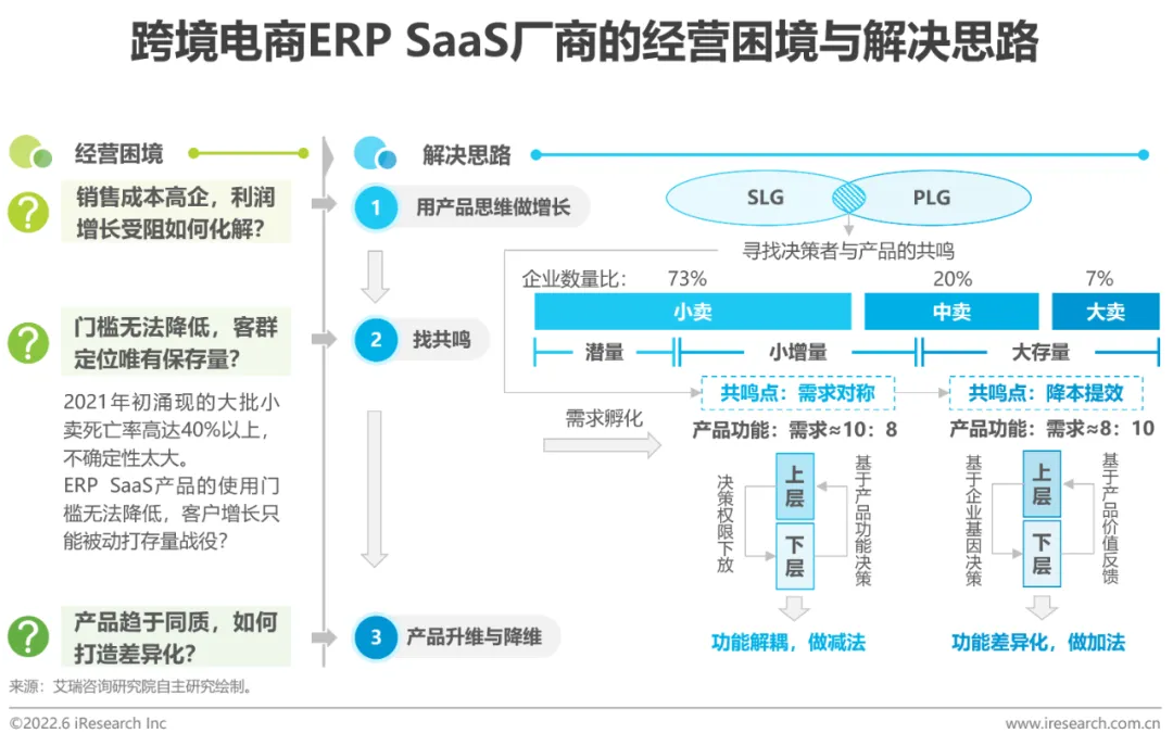 ERP并不适用PLG,但用产品思维做增长亦是可行之道。“小增量”对ERP SaaS的需求处于试探阶段,只需要“适可而止”的产品功能,并由下至上推动顶层决策者,因此对产品降维才能抓住小增量。对ERP SaaS有使用体验的“大存量”来说,需求从“帮管理”向“见效果”转变,专业的财务报表,精细的仓储管理等让卖家更有意愿继续沉淀,因此对“大存量”客户打造差异化功能才有意义。