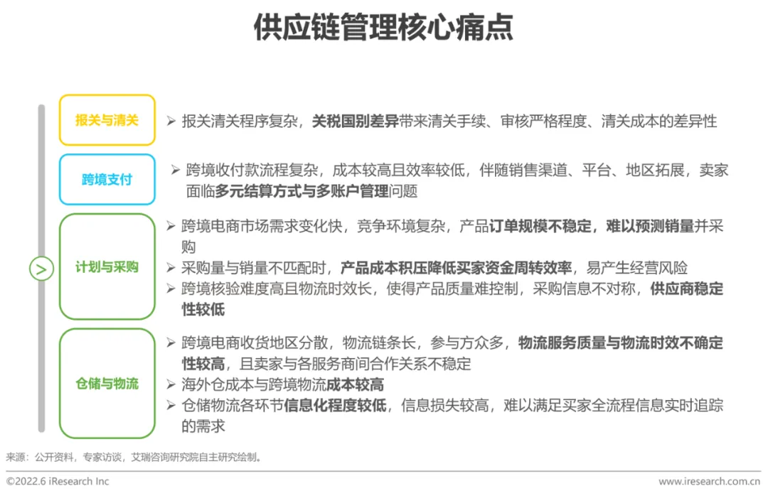 跨境电商供应链SaaS根据链路不同可分为跨境支付管理、仓储物流管理和采购寻源管理,贯穿跨境资金流、物流和信息流。由于跨境供应链链路长、环节多,导致行业存在透明度低和信息差等问题,制约了相关SaaS的标准化,也因此跨境供应链厂商的生态网络完整性是其主要竞争壁垒之一。