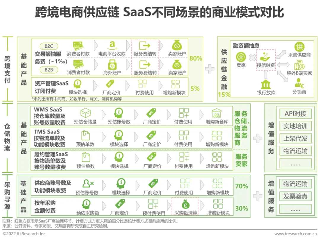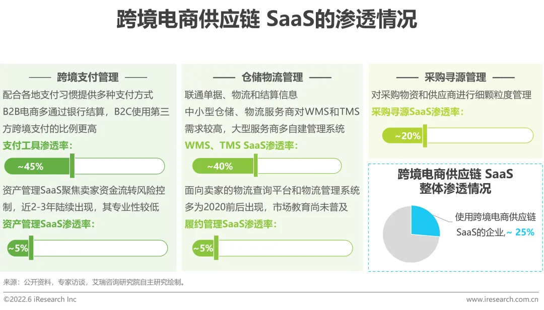 覆盖用户下单到收到货品的跨境资金、物流、产品供应环节跨境电商供应链SaaS覆盖用户下单后的资金、物流和产品流转环节,分别对应跨境支付管理、仓储物流管理和采购寻源管理三个细分赛道。各赛道对应SaaS产品及功能有:(1)跨境支付管理SaaS:按功能可分为支付工具和风险管理,支付工具覆盖收单、收付款、结汇等环节,资产管理覆盖企业资金及风险控制,SaaS化程度较高;(2)仓储物流管理SaaS:按服务对象分为WMS SaaS、TMS SaaS和履约管理SaaS,其主要功能为根据用户卖家订单进行发货和调配运力进行物流配送;(3)采购寻源管理SaaS:当仓储货品不足时,及时补货并管理供应商。由于供应商多为国内供货商,因此相比跨境支付与仓储物流,采购寻源的跨境特殊性较弱。