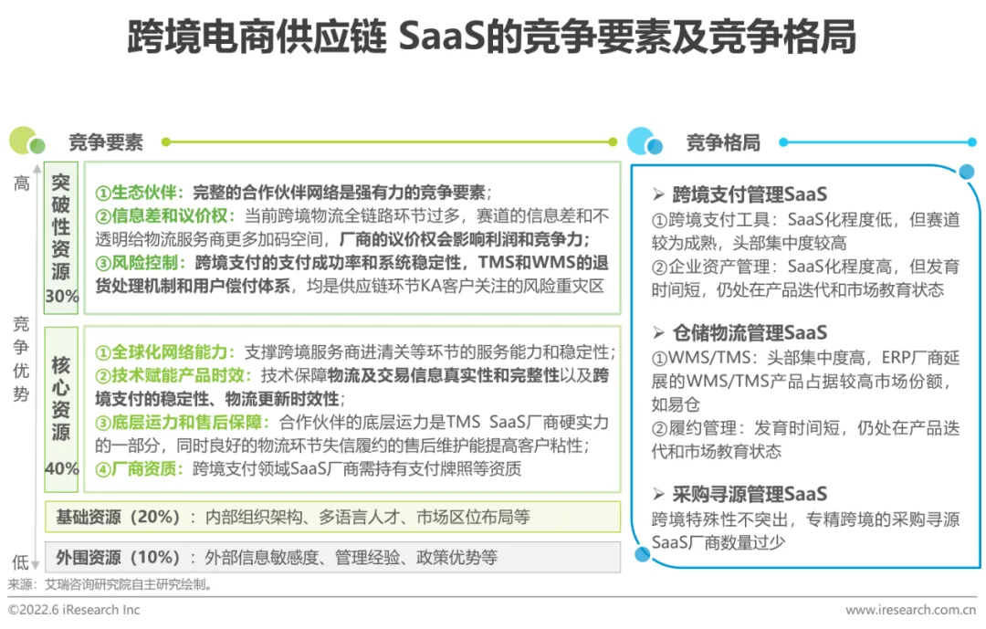 行业信息不对称,服务卖家的供应链市场竞争格局仍不明晰受行业透明度低、信息不对称等影响,跨境电商供应链SaaS整体发展较缓慢,整体处于市场教育阶段,竞争格局尚不明朗。在此环境下,厂商掌握的市场动态信息和对上下游的议价权会成为脱颖而出的重要优势。对跨境支付管理厂商来说,依靠资金和信息安全以及业务合规性建立起的长期信任关系是主要竞争力;对仓储物流管理厂商来说,服务商伙伴的底层运力和全球网络是赢得大客户青睐的重要因素;对采购寻源管理厂商来说,构建供应商的关系网络是主要竞争力。