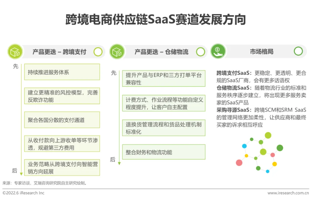 整合各国家分散的支付渠道和物流资源,逐步构建行业秩序随着市场教育的深入和行业标准的建立,跨境电商供应链SaaS赛道将呈现以下趋势:(1)跨境支付SaaS短期内将持续通过服务滋养用户,同时基于业务立足点深度整合当地支付渠道,并向供应链上游渗透;(2)仓储物流SaaS持续完善退换货管理流程,提高与打单平台和ERP的兼容性,并横向整合财务和物流功能;(3)未来3-5年内跨境电商供应链SaaS相关赛道的竞争格局仍不会明朗,但会逐步释放发展潜力,也会吸引更多资本。