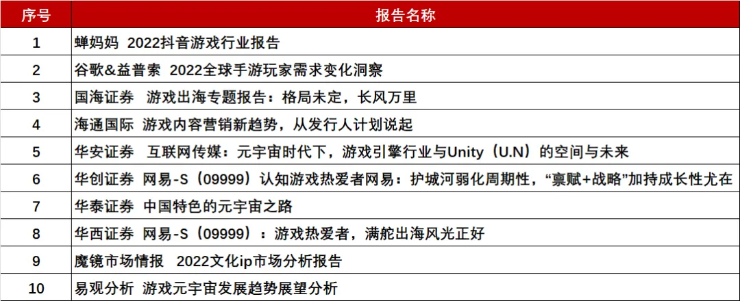 上述10份报告中,最受从业者关注的TOP3报告分别为《谷歌&益普索 2022全球手游玩家需求变化洞察》、《游戏出海专题报告:格局未定,长风万里》、《海通国际 游戏内容营销新趋势,从发行人计划说起》。