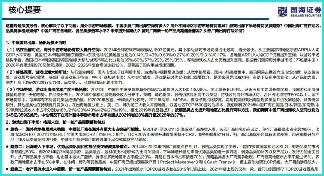《游戏出海专题报告:格局未定,长风万里》报告提要
