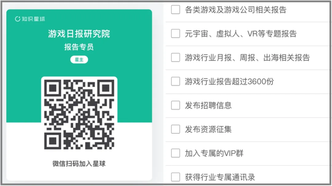 除此之外,游理游据研究院除了收藏有超过3万份游戏行业不同类型数据报告、项目文档之外,更有行业内通讯录和专属的VIP群帮你快速进入高质量游戏圈层。加入游理游据VIP社群,不仅能够快人一步查看行业最新报告,同时还能够优先享受【行业服务】栏目的“特权”。