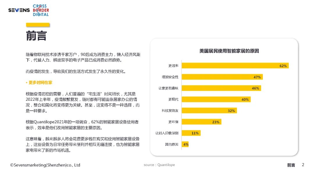 根据Quantilope2021年的一项调查,62%的智能家居设备使用者表示,效率是他们改用智能家居的主要原因。