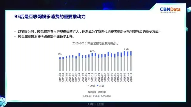 值得一提的是,95后将是互联网娱乐消费的重要推动力,以猫眼电影票的消费占比为例,95后在消费人群规模快速扩大。
