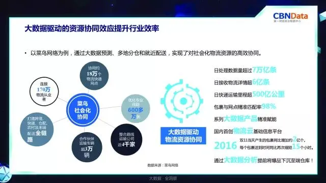 1、数据连接提升效率。如淘宝、天猫、UC和微博数据连接让营销更精准,菜鸟网络用大数据驱动物流协同。