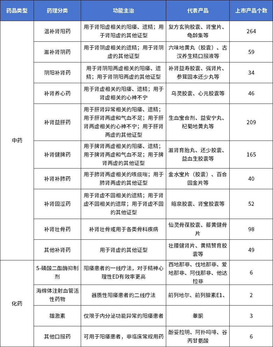 从功能主治来看,抗阳痿药以5型磷酸二酯酶抑制剂(化学药)和温补肾阳药(中成药,上文述及)为主。