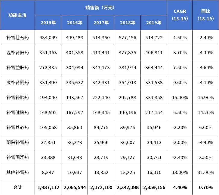 经调研,中国补肾中成药各功能主治产品2015-2019年销售额及占比见下表和下图。补肾中成药总销售额5年复合增长率为4.4%,2019年同比增长0.7%,达到236亿元。排名前三的依次为补肾壮骨药、温补肾阳药和补肾益肝药。