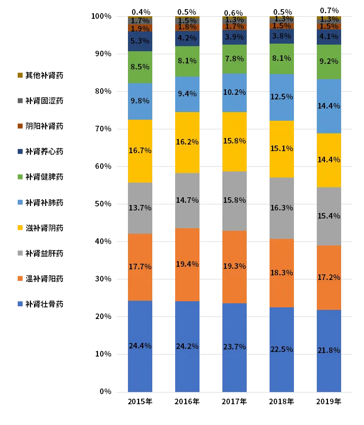 此外,国家医保目录将补肾相关中成药分为:扶正剂(温补肾阳剂、滋补肾阴剂、滋补肝肾剂、补肾养血剂);固涩剂(补肾缩尿剂);壮骨剂(补肾壮骨剂);安神剂(补肾安神剂);祛瘀剂(补肾活血剂)。