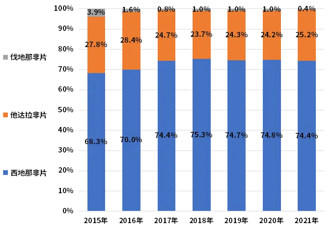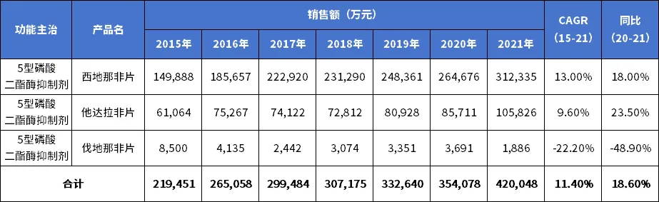经调研,“5型磷酸二酯酶抑制剂”重点产品2015-2021年销售额及占比见下表和下图。其总销售额7年复合增长率为11.4%,2021年同比增长18.6%,达到42亿元,其中西地那非片销售额占比常年保持在75%左右。