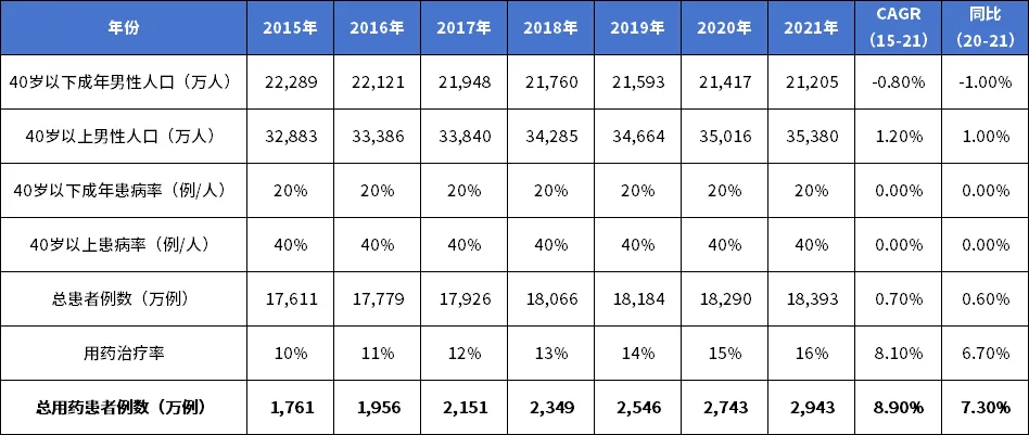②阳痿患病率参考流行病学数据,我国40岁以下成年男性人口ED患病率取20%,40岁以上男性人口ED患病率取40%,且患病率保持相对稳定。