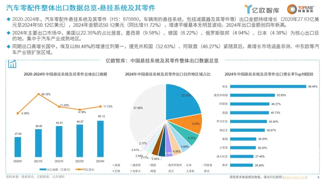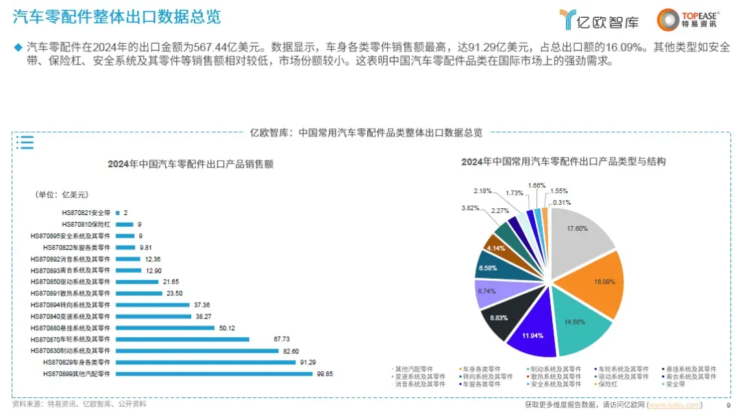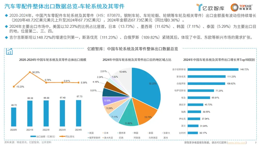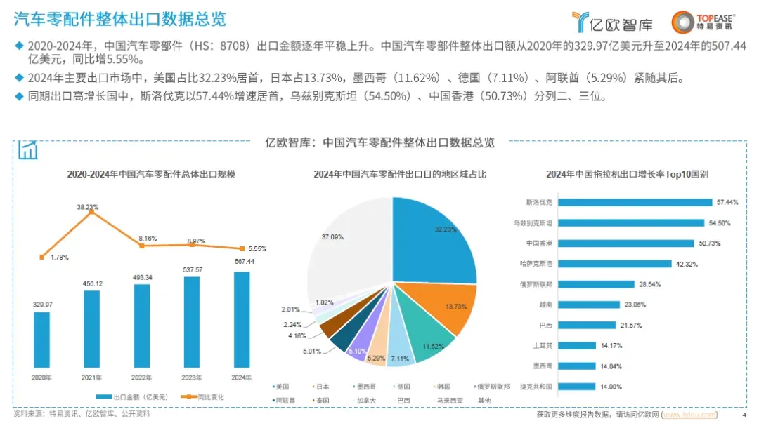 2025年,中国汽车零配件出口总额已达567.44亿美元,连续五年稳步增长,展现出强劲的全球竞争力。美国、日本、墨西哥、德国和阿联酋稳居前五大出口目的地,而斯洛伐克、乌兹别克斯坦、中国香港等新兴市场则以超50%的年增长率成为增长新引擎。细分品类中,车身零件、制动系统与车轮系统贡献突出,分别占据出口结构的前三位,反映出国际市场对中国高性价比、规模化供应能力的高度依赖。