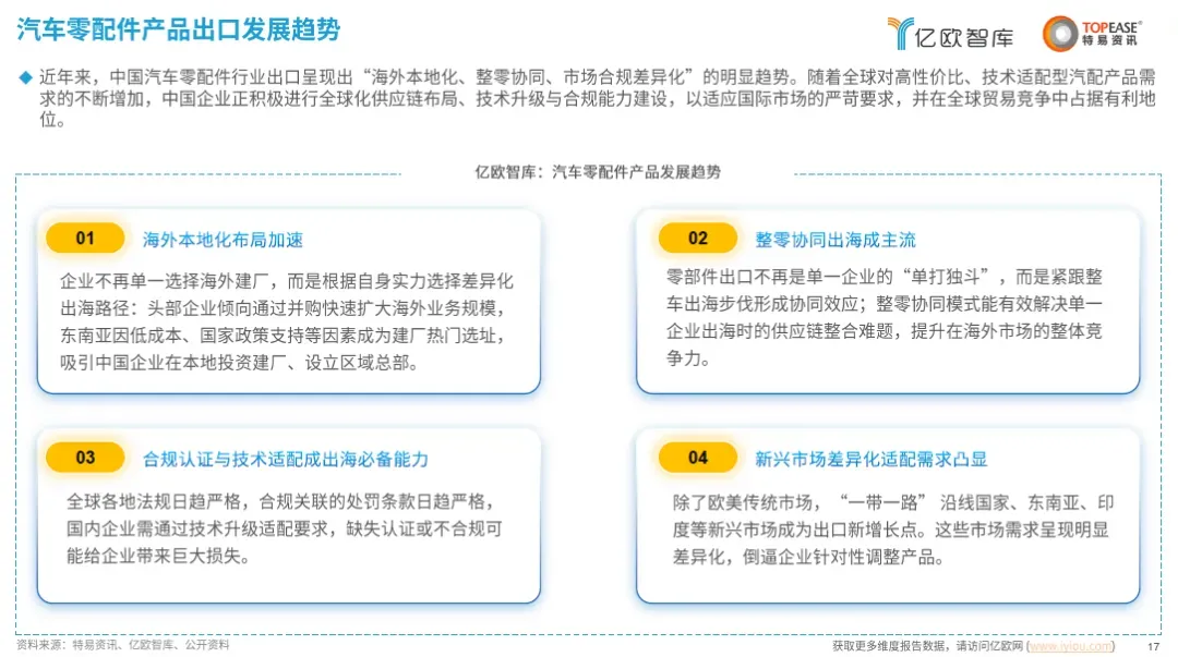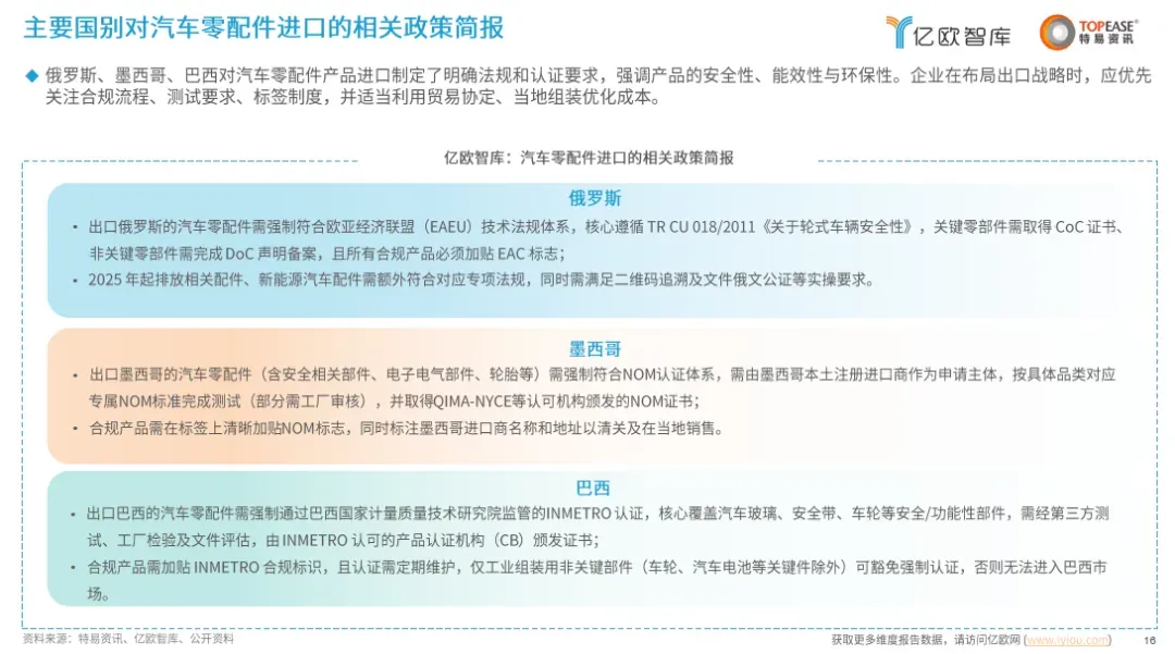 面对全球汽车产业向电动化、智能化加速转型的趋势,中国汽配企业正从“单一部件出口”迈向“模块化解决方案输出”,并紧跟整车出海步伐,形成整零协同的新模式。与此同时,海外本地化布局加速推进,尤其在东南亚地区,通过建厂、并购等方式深度嵌入区域供应链。然而,合规门槛不断提高——俄罗斯的EAC认证、巴西的INMETRO、墨西哥的NOM体系等,正成为企业出海必须跨越的技术与制度壁垒。