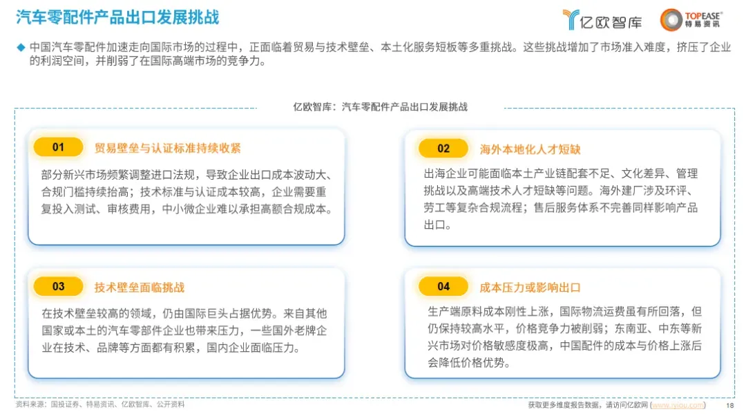 尽管机遇广阔,挑战亦不容忽视:中小微企业难以承担高昂的认证成本,海外人才短缺制约本地化运营,原材料与物流成本挤压利润空间。未来,唯有兼具技术适配能力、合规意识与全球化视野的企业,才能在全球汽配市场中脱颖而出。