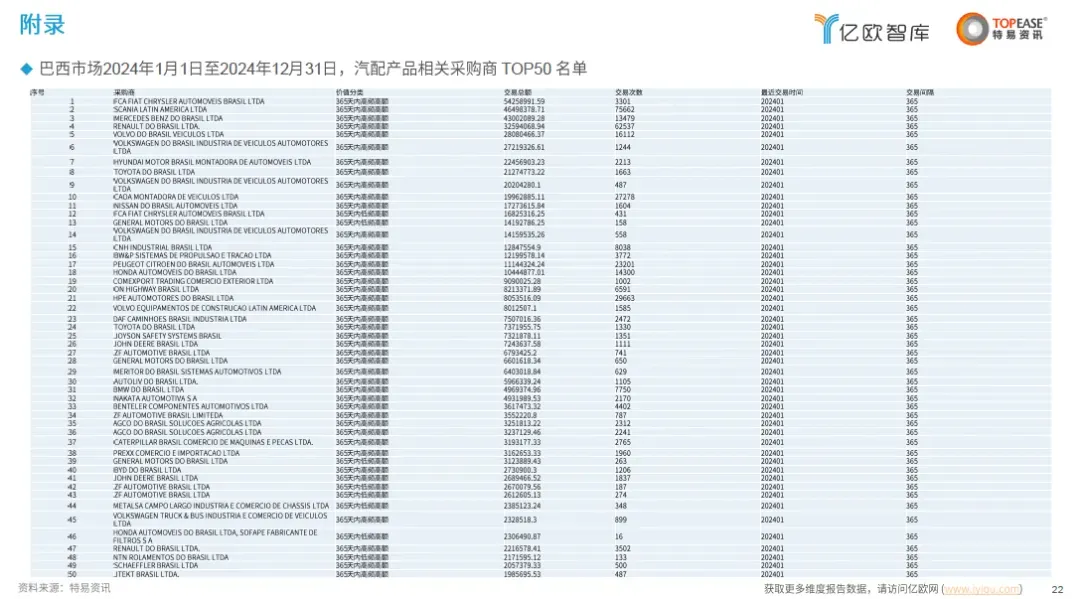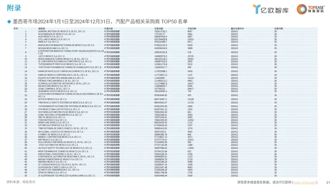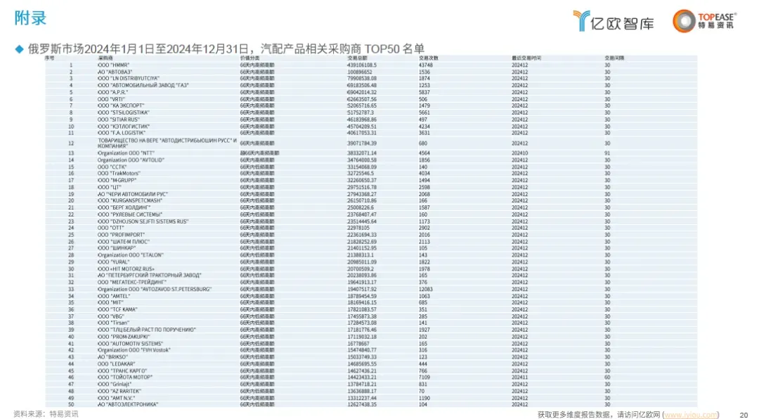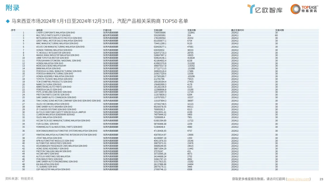 报告深入剖析了俄罗斯、墨西哥、巴西、马来西亚四大重点市场的采购行为与政策环境。例如,俄罗斯前十大采购商半年内交易额超20亿美元,其中本土车企AVTOVAZ、GAZ及大型分销商HMMR需求旺盛;墨西哥则聚集了通用、大众、奥迪等国际整车巨头,对高质量、高频率供货提出严苛要求。这些洞察为企业精准锁定目标客户、优化渠道策略提供了关键依据。