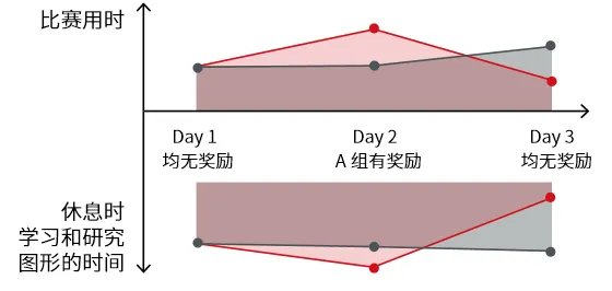 而这种状态并不是通过考核这种外部驱动力达成的。著名的索玛立方块实验通过三天对A和B两组人员的“奖励设置”,统计两组人员参与比赛用时以及休息时间用来观察图形的时间,如下图。