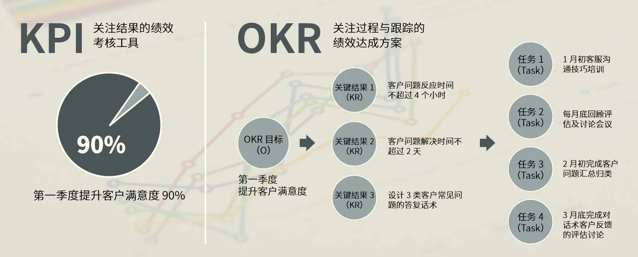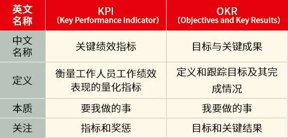 二者的主要区别在于:在目标分解上,OKR是自上而下与自下而上并存的。同时,OKR还伴随着目标共识、高度参与、公开透明、即时沟 通和不断修正。此外,从关注点的变化来看:KPI直接对应结果,并作为考核工具,而OKR是关注过程与跟踪的绩效达成方案。