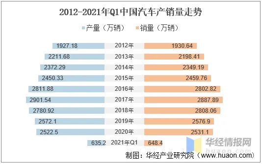 随着我国汽车产业随着经济发展日益壮大,汽车经销商随着汽车产业的发展而不断成长,从我国汽车产销量来看,据统计,截至2021年第一季度我国汽车产量635.2万辆,同比增长81.7%,销量为648.4万辆,同比增长75.6%。资料来源:中国汽车工业协会,华经产业研究院整理