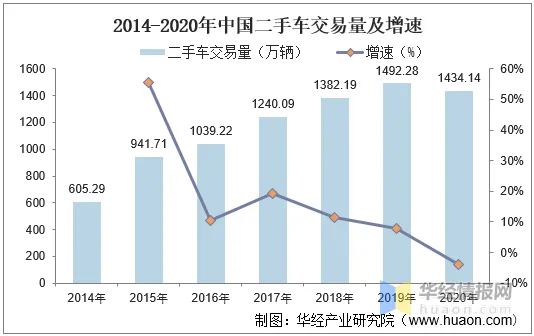 据统计,截至2020年我国二手车交易量达到1434.14万辆,同比下降3.9%;2020年5月1日之前,我国企业二手车交易的增值税是2%(实际征收税率),而个人交易则不征增值税,因此二手车交易过程中,经销商扮演的更多是中介角色,二手车业务对经销商来说是经纪业务,而非经销业务。汽车经销商从事二手车业务,主要是收取交易佣金。资料来源:中国汽车流通协会,华经产业研究院整理