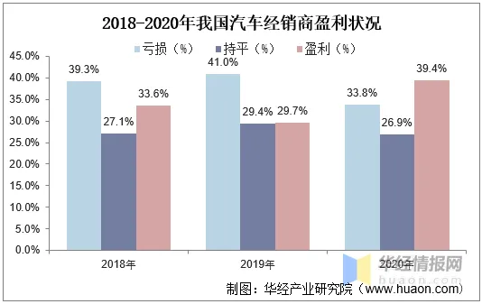 2020年突发新冠疫情,全年汽车市场跌宕起伏。上半年,汽车市场一直处于负增长状态,厂家及时推出对经销商的帮扶政策,缓解了疫情带来的生存压力。下半年,汽车市场快速回暖,全年汽车经销商生存状况明显改善,亏损面比上年下降。资料来源:中国汽车流通协会,华经产业研究院整理