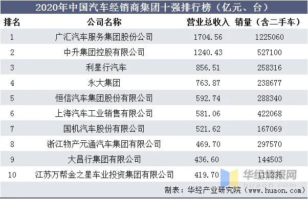 从中国汽车流通协会发布的《2020中国汽车经销商集团十强榜单》来看,广汇汽车服务集团股份公司位居第一,2019年营业收入为1704.56亿元,汽车总销量(含二手车)为1225060台;排第二的是中升集团控股有限公司,2019年营业收入为1240.43亿元,汽车总销量(含二手车)为527100台;其次是利星行汽车,2019年营业收入为856.51亿元,汽车总销量(含二手车)为258316台。