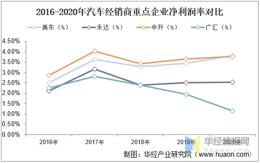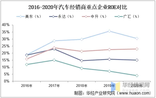 从ROE来看,美东ROE水平最高,2020年达到30%,中升为23%,永达为15%,广汇为4%。从净利润率来看,2020年中升和美东净利润率均为3.7%,永达为2.4%,广汇为1%。从服务满足率来看,2020年中升服务满足率为104%,美东为93%,永达为83%,广汇为49%。2017年之后,广汇汽车ROE和净利润率下滑较多,主要原因是公司中高端品牌占比较高,2018年开始国内乘用车总销量下滑较为明显,影响了广汇汽车销量增长。针对小排量汽车的购置税优惠政策(小于等于1.6L)2018年1月1日起停止;此外,2019年7月1日起乘用车实施国六排放标准,经销商在2019年Q2去库存折扣较大,也影响了广汇汽车的利润率。2020年上半年新冠疫情爆发,也对中高端品牌汽车的需求影响较大,导致广汇汽车新车和售后业务受到较大的冲击。资料来源:各公司公告,华经产业研究院整理