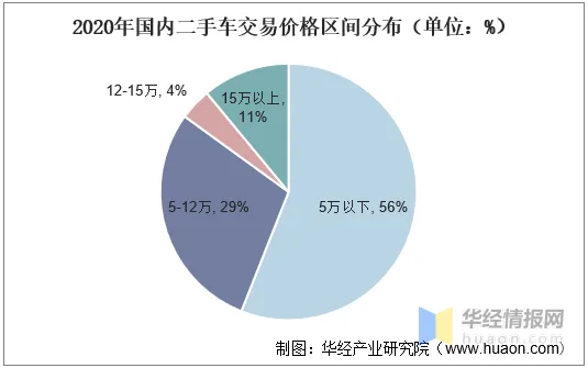 虽然国内二手车交易量规模较大,且总体呈稳定上升趋势,但目前还不是大型汽车经销商集团的主营业务,其收入和毛利的贡献较小,以2020年我国二手车交易价格区间分布来看,价格区间在5万元以下的占比为56%,5~12万元之间的占比为29%,12~15万元占比为4%,15万元以上的占比为11%。总体而言,成交价格在12万元以上的二手车占比较低,而这部分二手车通常是能给经销商带来较高利润的车型。资料来源:中国汽车流通协会,华经产业研究院整理
