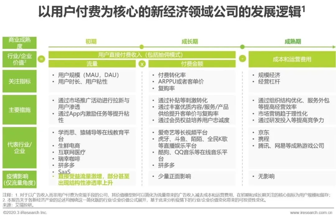 对于通过用户付费直接变现的企业,获客是初期的首要目标,而促转化、引导复购与内部运营效率的提高则往往是成长期和成熟期的重要考虑要素。疫情的爆发为不少行业带来了免费流量,其中一些处于发展初期的赛道将不仅受益于这一轮一次性的流量激增,更将得益于市场教育带来的系统性用户渗透率的提升。