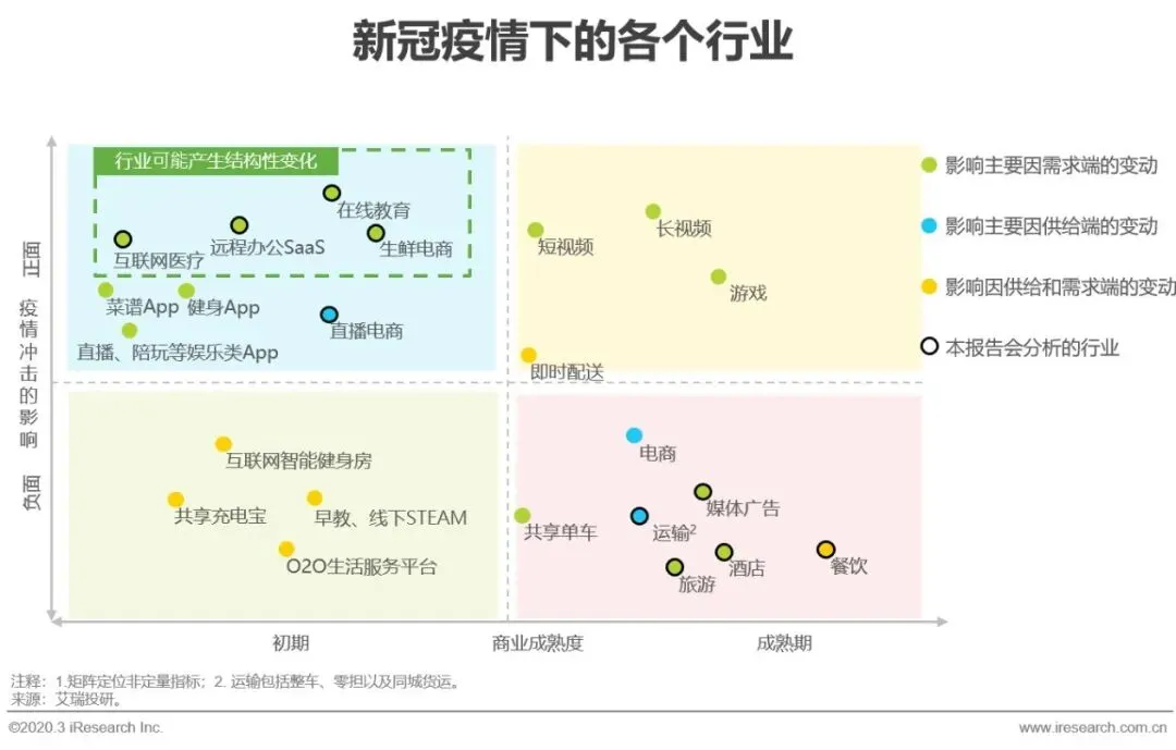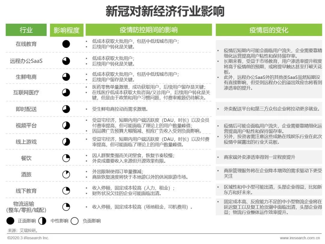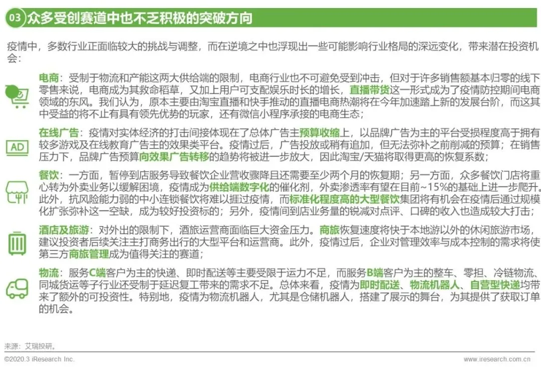 2020年开年的新冠肺炎疫情对新经济产业带来了打击,也揭示出产业的韧性。不少以数字化为特征的赛道在疫情中迎来结构性利好变化,部分受创赛道也可见积极的突破方向,其中具备快速恢复能力的标的将获得发展机会,这些都是投资者可以提前布局或留意的机会。
