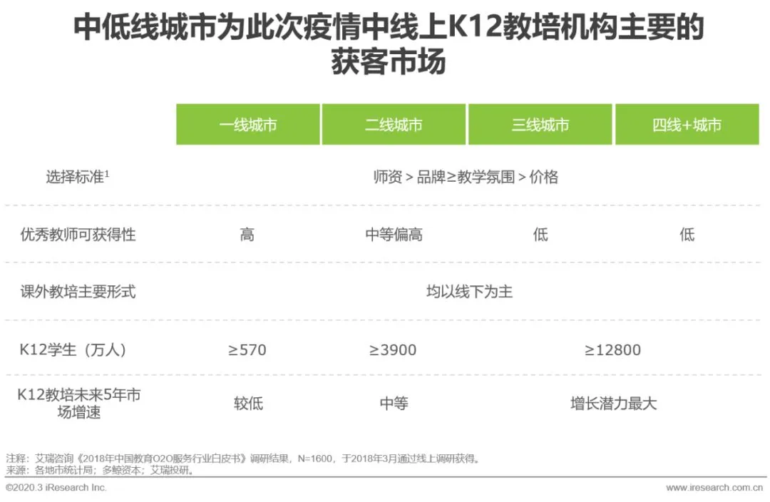 一方面,获客成本降低以及被拉长的寒假等外部条件为在线教育玩家带来了良好的发展契机。另一方面,多数线下教育机构“被线上”,在疫情防控期间尝试通过第三方工具或者自主开发系统进行直播教学,加速培养了用户习惯。此外,在生源多、优质教育资源相对紧缺、长期以本地中小教育机构为主的中低线城市,在线教培市场发展潜力强,借助此次全员上线的机会,在线教育玩家能以较低成本进入该市场。