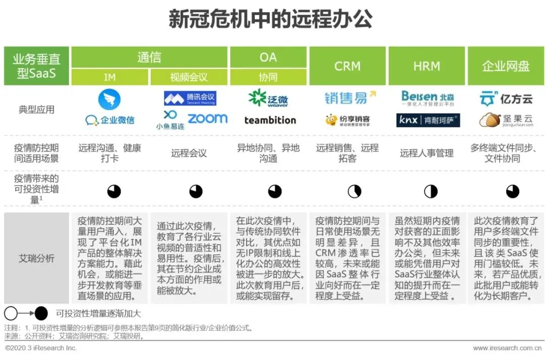 多个业务垂直型SaaS在此次疫情中展现并放大了其产品的特性和优点,突出了其在各行业内的可用性和易用性,如IM、视频会议以及OA协同。凭借其解决办公痛点的特质,在产品质量稳定的基础上,我们认为此番获取的用户中,相当一部分将在未来实现转化。