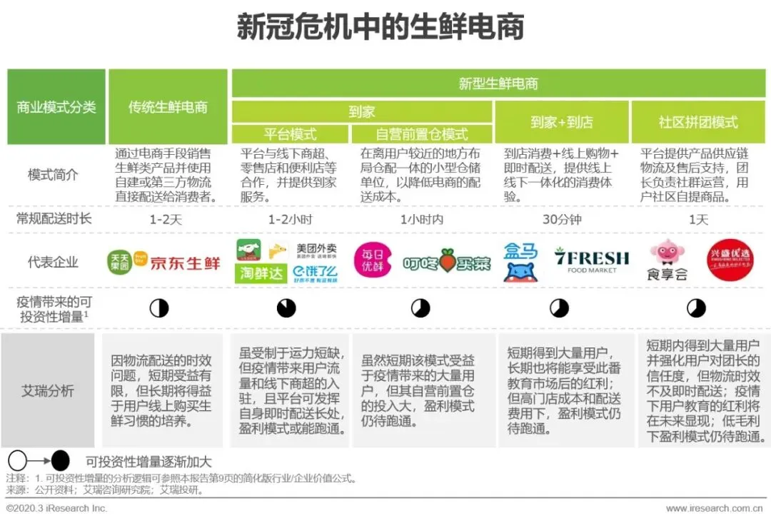 从短期来看,虽然疫情使得生鲜电商运力受限,但“到家”、“到家+到店”及社区团购模式均因此获得较大的流量和曝光。从长期来看,我们认为,此次疫情为平台、前置仓、“到家+到店”以及社区拼团模式的生鲜电商均带来了更好的发展机会,尤其对于平台模式,其不仅受益于用户端免费市场教育的红利,也将得益于供给端传统商超门店的加速线上化。
