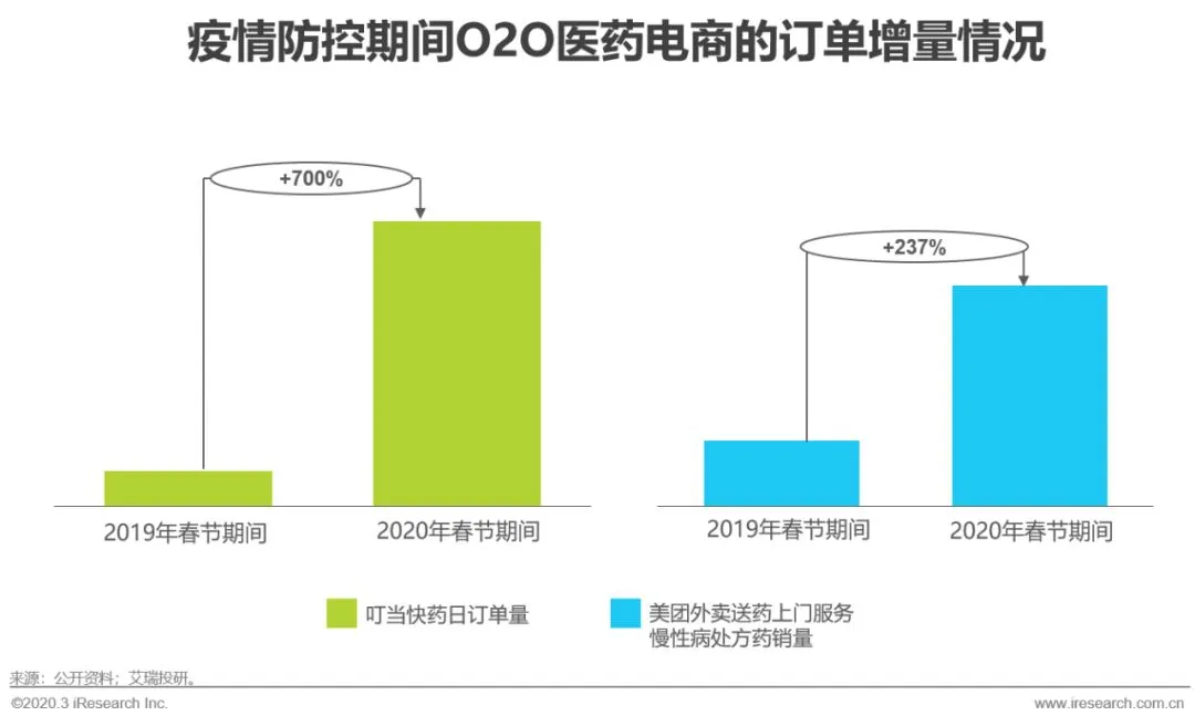 疫情使得用户对医药零售以及线上医疗的需求增加。医药零售方面,防疫物资引流作用加上健康居家抗疫的需求带动,叮当快药等O2O平台为用户和订单量激增。在线医疗服务方面,阿里健康、平安好医生等多个平台通过开展线上义诊、名医直播等方式,为公众提供线上问诊服务,解决了用户购药缺乏专业指导、医疗科普、去医院看病或有交叉感染风险等痛点。