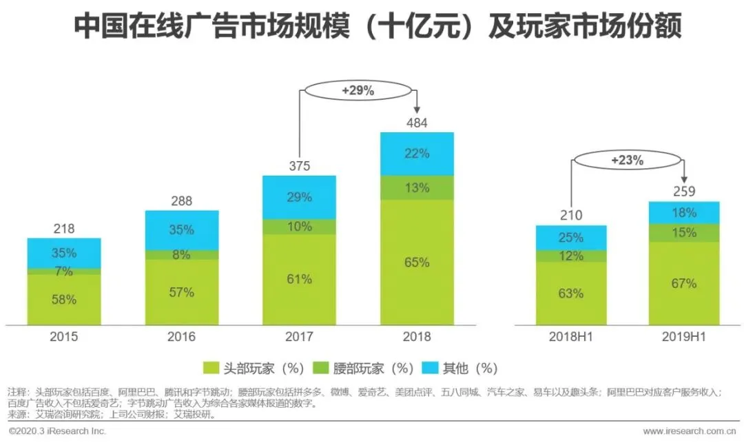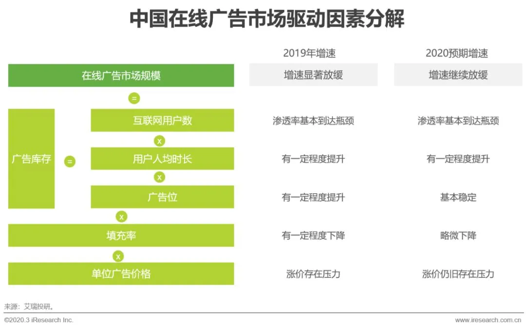 过去线上广告受益于用户流量持续增长以及线下预算往线上转移的趋势而发展迅速,而随着宏观经济增速放缓以及行业监管因素带来的广告主需求的疲软,2019年全年在线广告市场规模的增速大幅下滑,且我们预计这一趋势将持续至2020年。在市场竞争格局方面,头部及腰部玩家持续抢占其余中小玩家的市场份额,而随着中小玩家逐渐出局以及市场增量空间的收窄,头部玩家之间的竞争将更加激烈。
