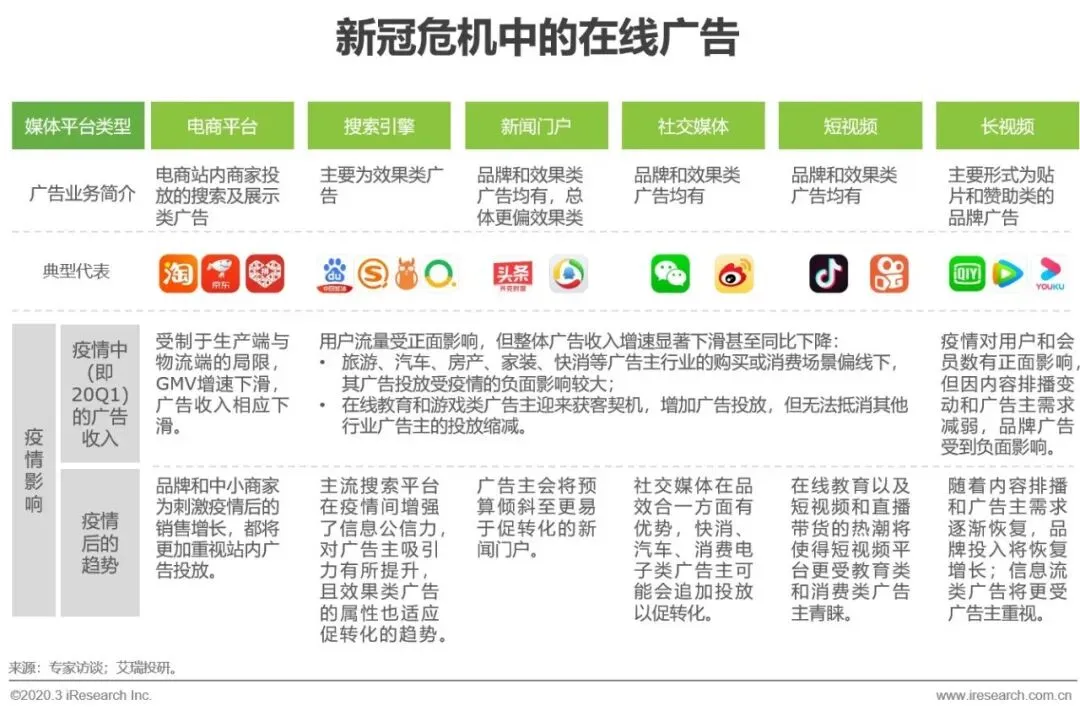 疫情对整体广告行业产生了一定负面影响,从广告主结构看,多数与线下活动关联度高的广告主均削减了疫情防控期间的广告投放,而游戏和在线教育类广告主的投放额则有所加大。疫情后,部分行业广告主可能会追投,但是预计全年广告投放额相比预期仍将出现一定程度下降。此外,广告主更专注于效果类广告或品效合一的趋势将在疫情后显得愈发明显。