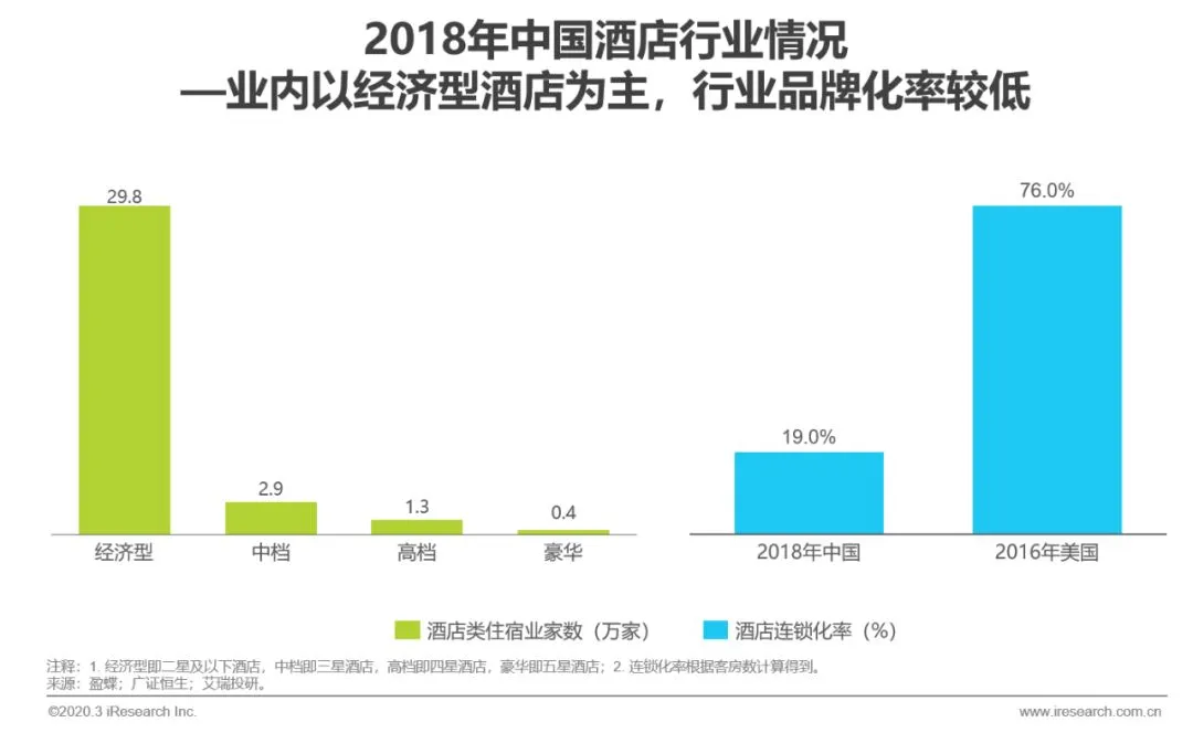 我国商旅管理在商旅总支出中的占比远低于美国等发达国家,且行业内集中度较低,竞争格局分散。而此次疫情过后,部分企业对于差旅费用控制和成本管理的需求将被强化,商旅管理服务的渗透率预期将得到提升。酒店行业总体连锁化率仍处于相对较低水平(18年仅19%),且数量占比最多的经济型酒店该比率更低(18年为16%),在疫情对酒店的业绩打击下,集团型的优势更加突出,未来酒店市场的连锁化有望进一步提升。