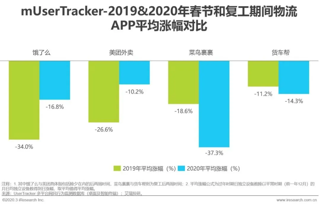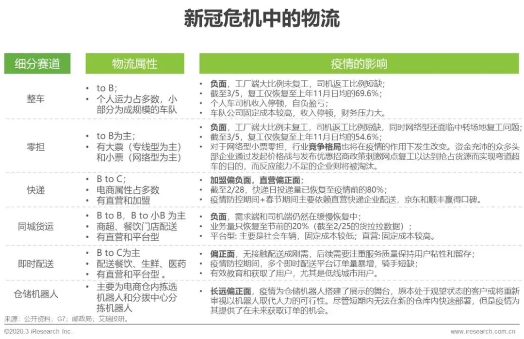 疫情拖慢了工厂端和运力端的复工恢复率,对大多数物流子行业均产生了短期负面影响,部分承担固定运营成本较高且反应能力不足的中小型物流企业可能会面临市场出清;另外,即时配送成为C端用户购买生鲜、医药等消费物资的刚性需求,成功获取大批用户,后续需要注重保持用户粘性和提高留存比例。
