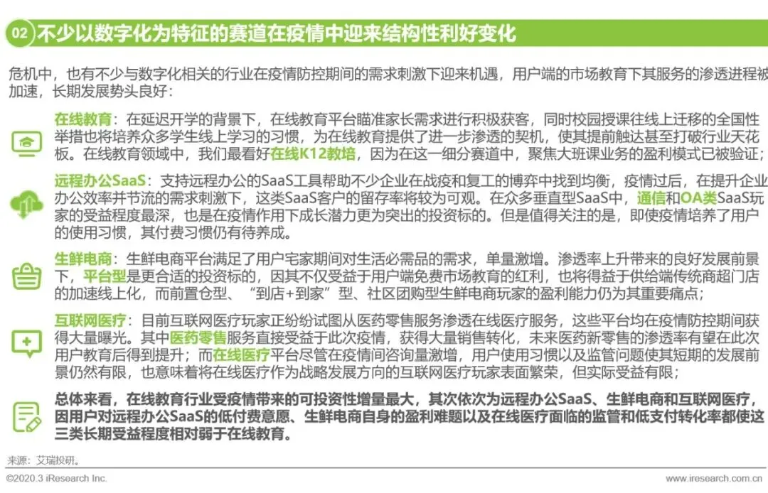 疫情或为在线教育、远程办公SaaS、生鲜电商以及互联网医疗行业带来结构性变化。这些行业都拥有以下特征:行业商业成熟度在早期,用户渗透率仍有大幅上升的空间,而疫情有希望加速这部分行业的用户教育和获取,提早触达甚至打破行业规模的天花板。其中,在线教育行业受疫情带来的可投资性增量最大,其次依次为远程办公SaaS、生鲜电商以及互联网医疗。