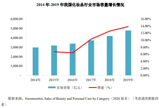 根据欧睿的统计数据显示,2019年我国化妆品行业整体市场容量达到4777亿元,2014 年-2019年的年均复合增长率达到9.9%,化妆品行业正处于高速增长期。
