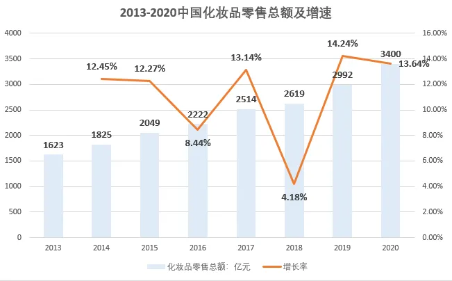 2013-2020年我国化妆品零售总额从1623亿元,上升到2020年3400亿元,复合增长率为11.14%。