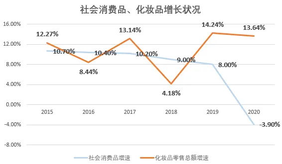 2020年,新冠疫情并没有影响化妆品行业,化妆品消费增长了13.64%,比社会消费品高出17个百分点。