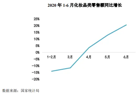 而4月开始,化妆品市场立刻开始恢复,到2020年6月化妆品零售额同比去年增长了20%左右。