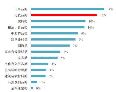 上图为2019年社会消费品零售品类,化妆品行业排名第二,仅次于日用品类的增长。