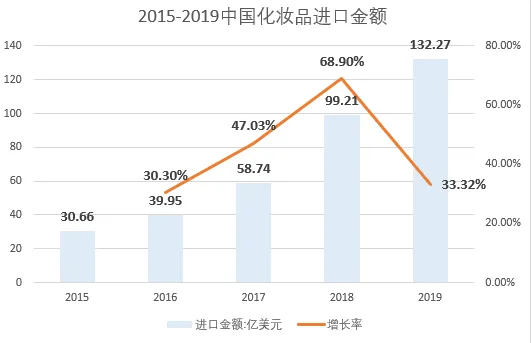 从进口数据来看,2015-2019年,我国化妆品进口额从30.66亿美元上升至132.27亿美元,复合增长率为44.12%。