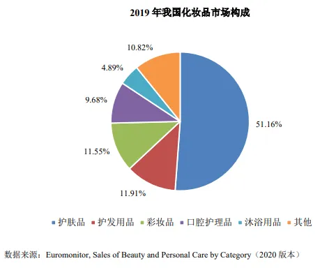 护肤品占据化妆品行业的半壁江山。根据欧睿数据,2019年我国护肤品占化妆品51.16%的市场份额。
