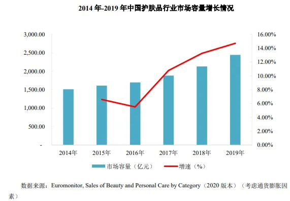 根据贝泰妮招股说明书中的数据,2014年-2019年中国护肤品市场的年均复合增长率达到 10.1%,在考虑通货膨胀的情况下,增速略高于化妆品行业的整体增速。