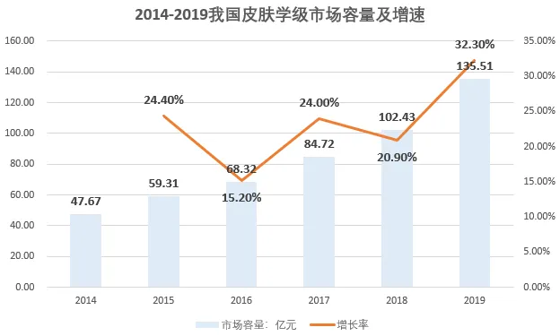 根据欧睿的数据,2014-2019年,我国皮肤学级护肤品的市场容量从47亿元,上升至135亿元,复合增长率为23.2%,远高于化妆品和护肤品的行业增速。